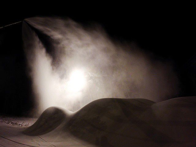 Оснежение начинается с того, что по склону точечно расставляют снежные пушки и подключают их шлангами к трубам. Как только установится необходимая температура, пушки включают и начинают пылить большие снежные кучи. Издалека они кажутся мягкими и пушистыми, но если вы захотите по ним прокатиться, то будете огорчены: по состоянию они больше похожи на кусок бетона, чем снега.
