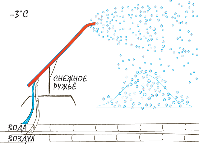Искусственный снег делают из воздуха и воды. Для этого на склон устанавливают снежные пушки (или ружья) и подключают их к трубам. Трубы эти проложены вдоль горнолыжных трасс. По одной трубе из водоёма забирается вода, по другой поступает сжатый воздух. В снежной пушке они смешиваются и под давлением проходят через «распылитель». В результате получаются мелкие крупинки снега.